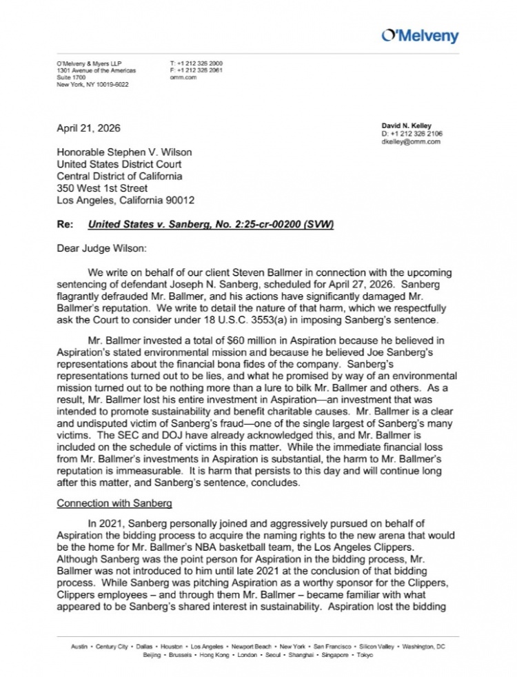 4月26日讯 近日,洛杉矶快船老板史蒂夫·鲍尔默在个人社交媒体上发布动态,并公开了一封致法官的信件,表示自己遭遇环保公司Aspiration巨额诈骗。